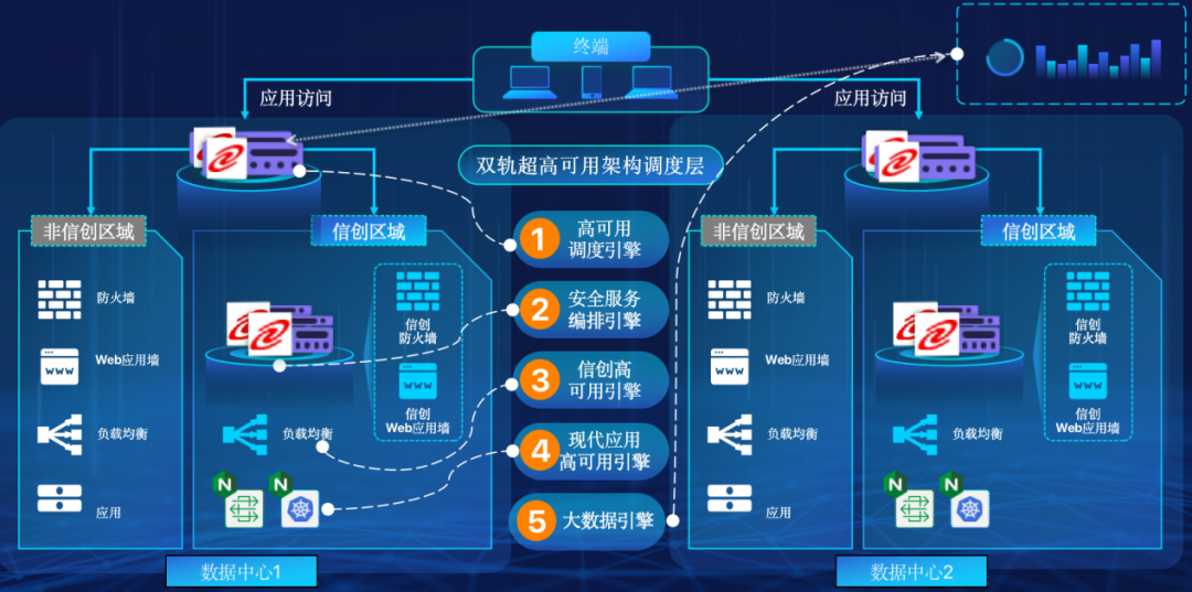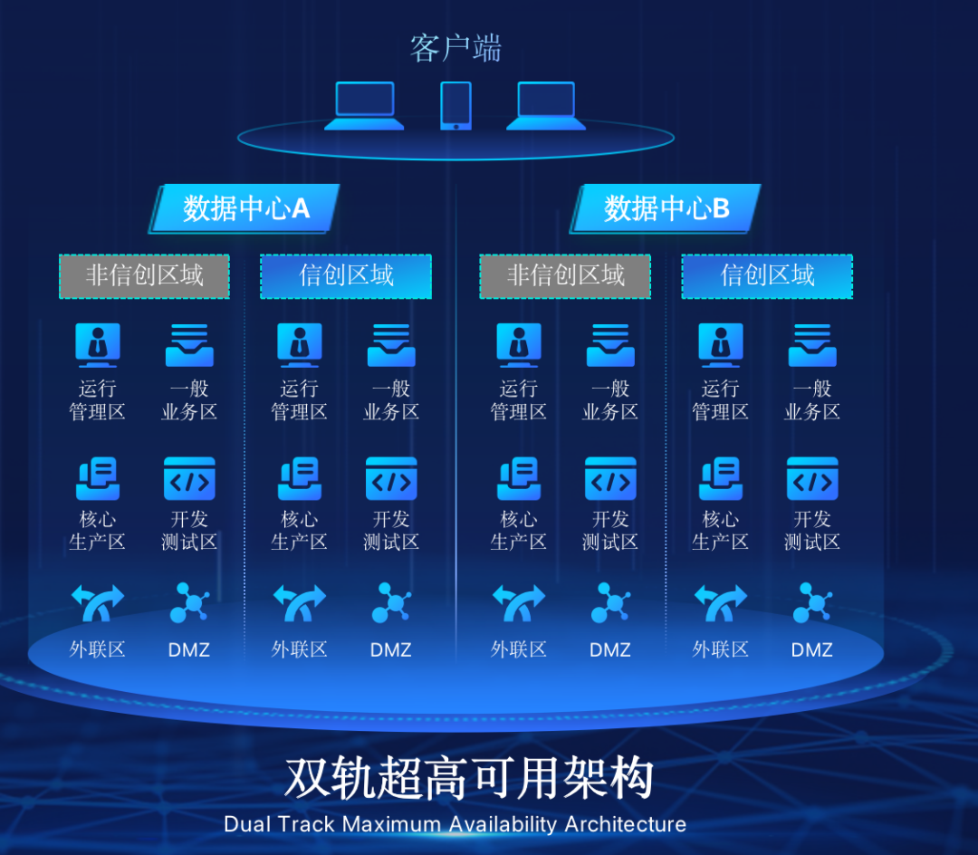 一竞技官网在企业面临自主创新IT基础重构过程中,推出的全新架构双轨超高可用架构(简称DTMAA),在双活数据中心的分区调度基础上,添加每个数据中心内信创域和非信创域的分域调度,来实现分区分域协同的多活双轨超高可用。